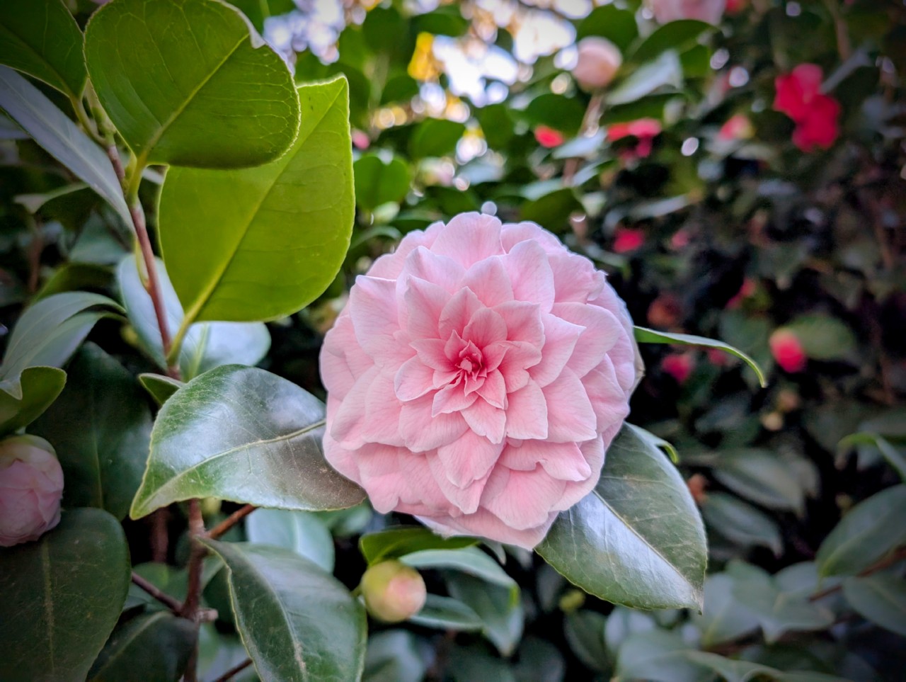 Magnifique fleur de camélia. Le vert des jeunes pousses qui resplendit au soleil est le spectacle à apprécier, en ce moment. A la campagne, c’est le jaune du colza qui est éblouissant.