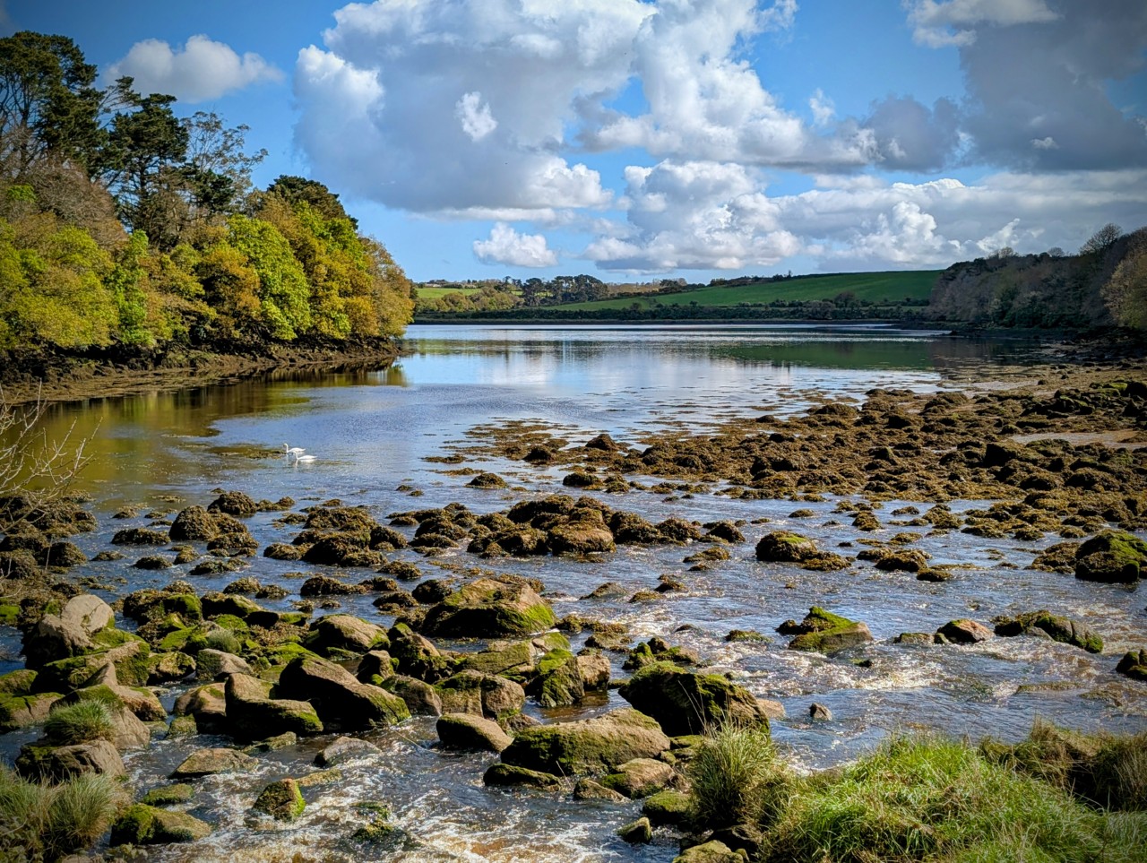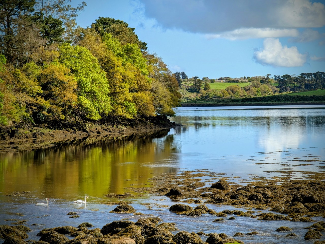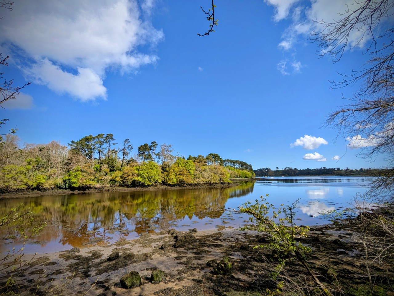 Et du côté de l’Aber Benoît où nous avions le mariage, la tempête a laissé place à un joli ciel tourmenté, à la fois bleu et plein de nuages fluffiesques, se reflétant sur des eaux calmes à marée basse.