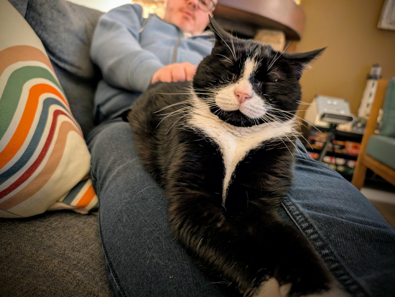 Arya a pris place sur le dossier du canapé et Sookie sur mes genoux, et comme vous le constatez c’est le gros stress du week-end en Bretagne.