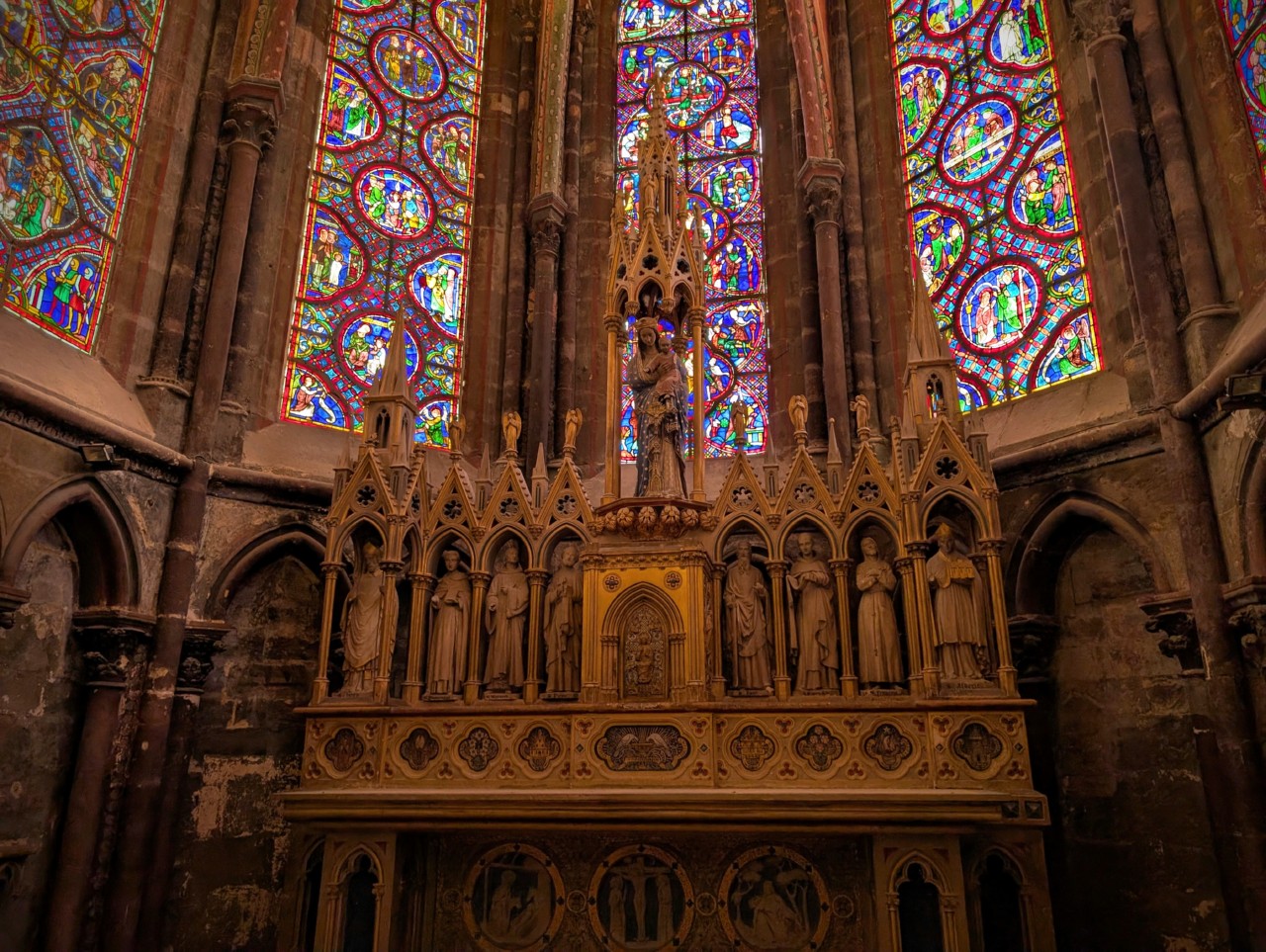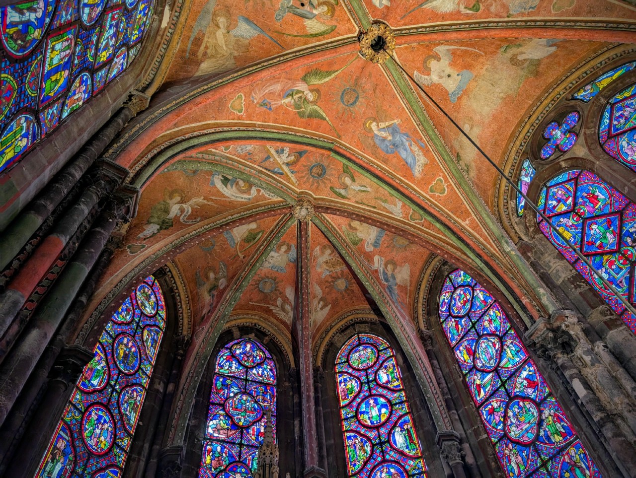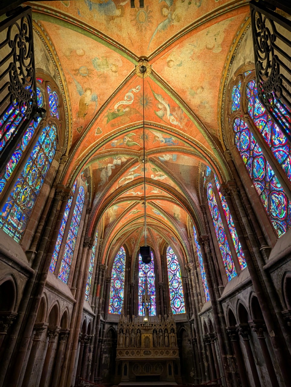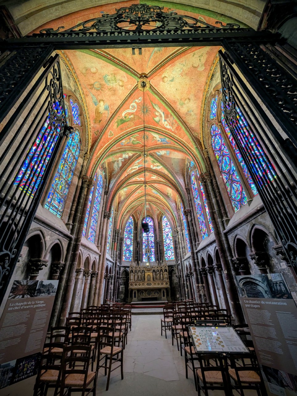 Mais surtout, une des chapelles, celle dédiée à la Sainte Vierge, vaut à elle seule le détour car on y trouve des vitraux très beaux et un plafond peint incroyable. Il a été redécouvert au 19ème alors qu’on l’avait recouvert d’un épais badigeon, mais qui a eu le mérite de conserver ces merveilles avec 47 anges musiciens à découvrir. Il y a un petit effet Sainte Chapelle parisienne avec cet endroit petit mais d’un charme fou avec ses ogives, ses immenses verrières et une ambiance un peu sombre et follement gothique.