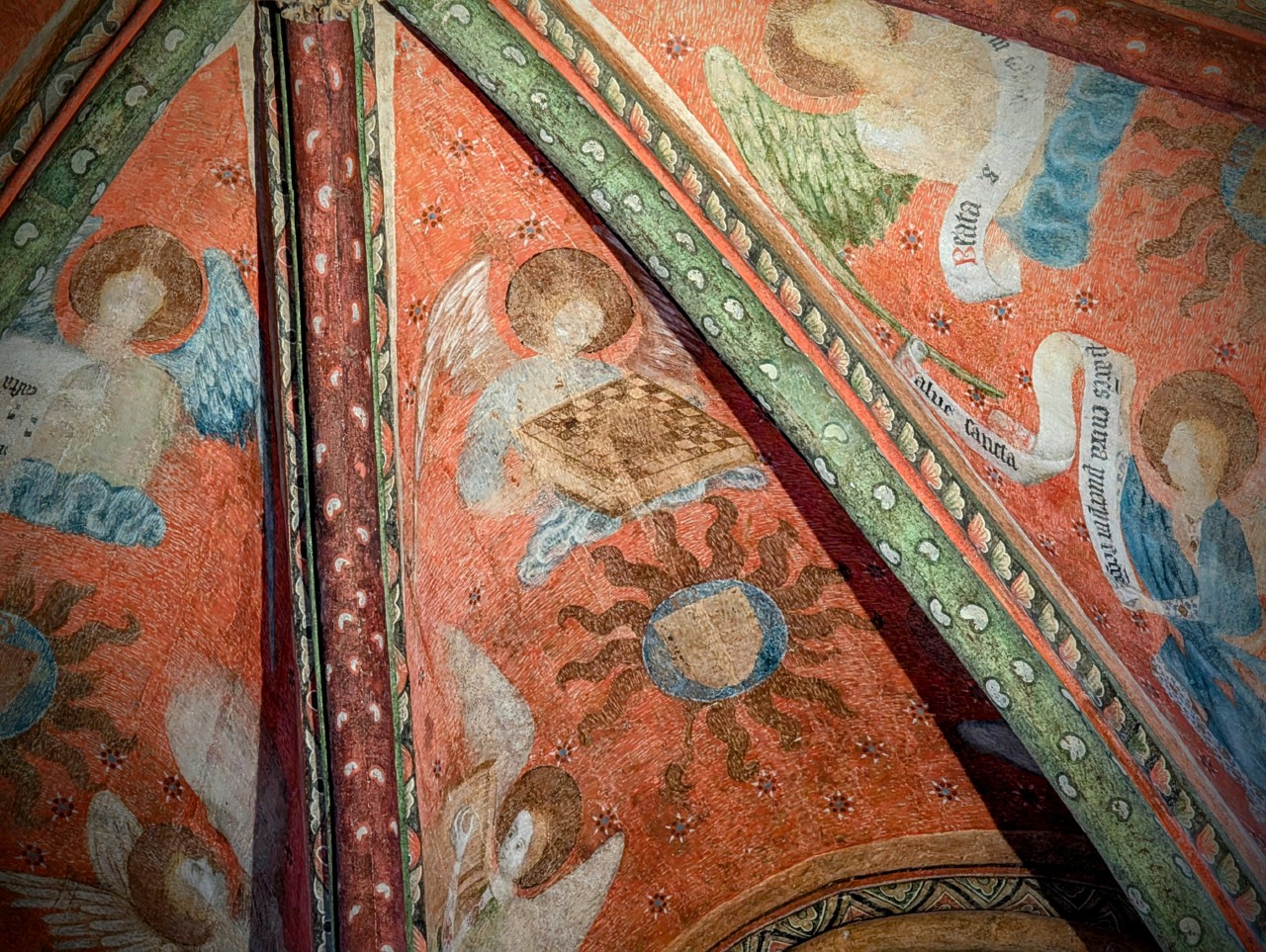 Les anges montrent les instruments de l’époque, et ça a permis d’apporter des informations intéressantes sur la facture des instruments médiévaux, et aussi un petit mystère avec cet échiquier musical qui reste assez énigmatique. Il n’y a que ce plafond et un autre ange avec le même instrument sur un vitrail de la même cathédrale. A priori, les recherches récentes à ce sujet ont prouvé qu’il servait à donner la note juste aux chanteurs et était joué d’une seule main. L’instrument possédait un clavier permettant de frapper les cordes avec des marteaux (et non de les pincer, comme au clavecin), ce qui en fait un possible ancêtre du piano, bien que ses cordes soient toutes de même longueur et que la hauteur soit modifiée par des tampons. Il a été reconstitué par des chercheurs et testé dans la cathédrale en 2024.