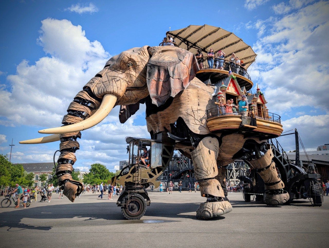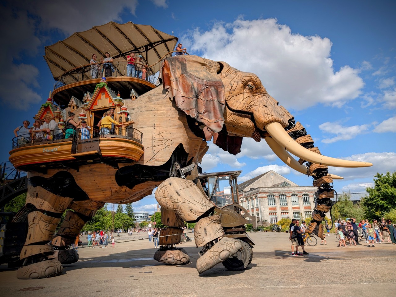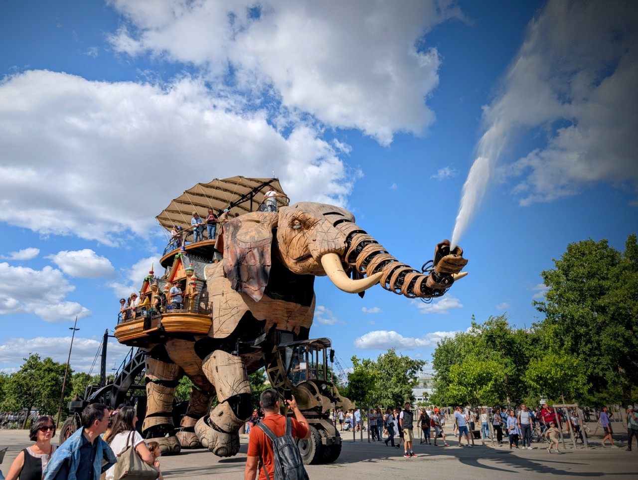 Et bien sûr, quand on est sur l’Île de Nantes, le Grand Eléphant n’est jamais bien loin… C’est toujours avec un regard émerveillé de minot qu’on regarde ce béhémot se mouvoir sur le parc des chantiers, et les gamins sont toujours en foule à la fois à fuir et à chercher l’arrosage forcé par la trompe habile du pachyderme mécanique.
