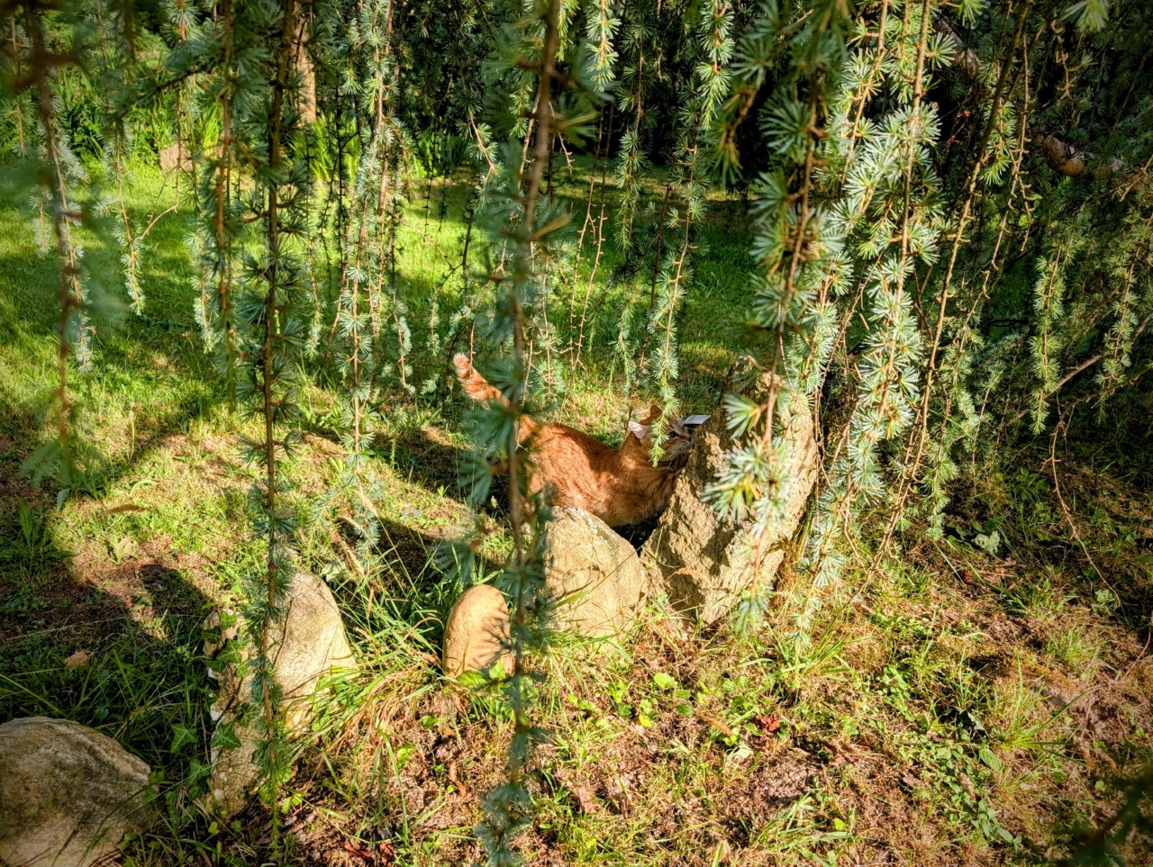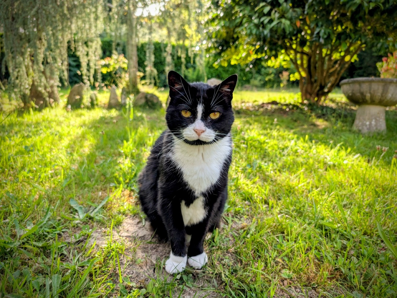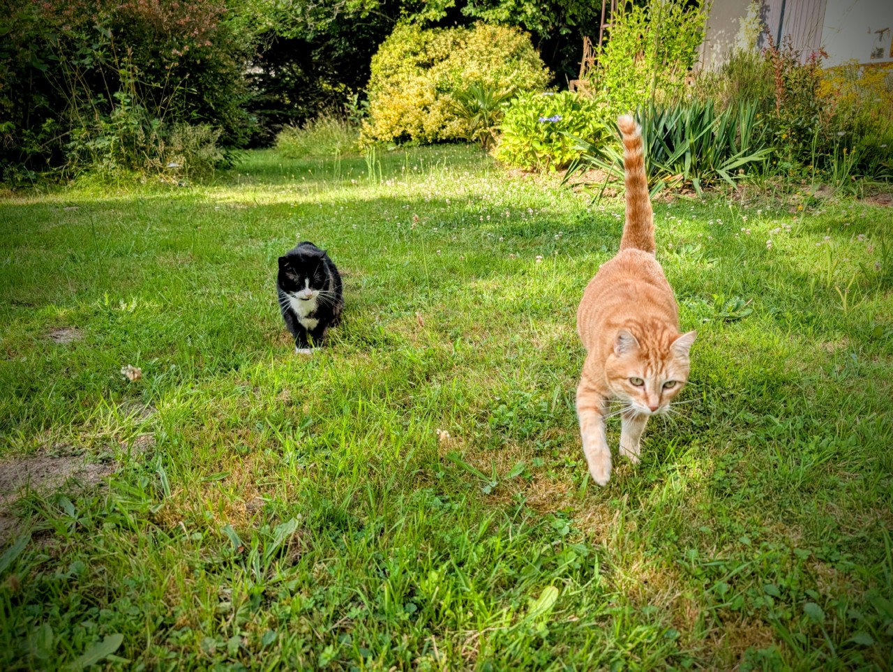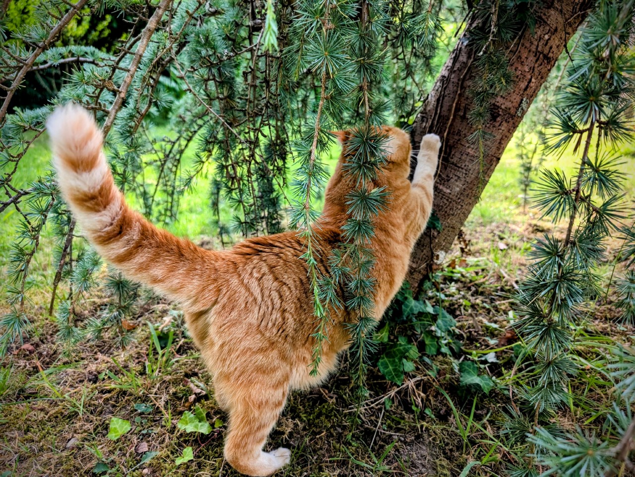Elles font leurs petites sorties régulières dans le jardin, toujours accompagnées par mon mari ou moi-même. A chaque fois c’est le même schéma, pour Arya c’est le terrain de chasse et pour marquer son territoire. Elle se faufile partout, elle cherche les souris dans l’herbe et surveille avec envie les oiseaux. Elle fait ses griffes sur les menhirs ou les arbres pour bien indiquer qu’elle est maîtresse des lieux.