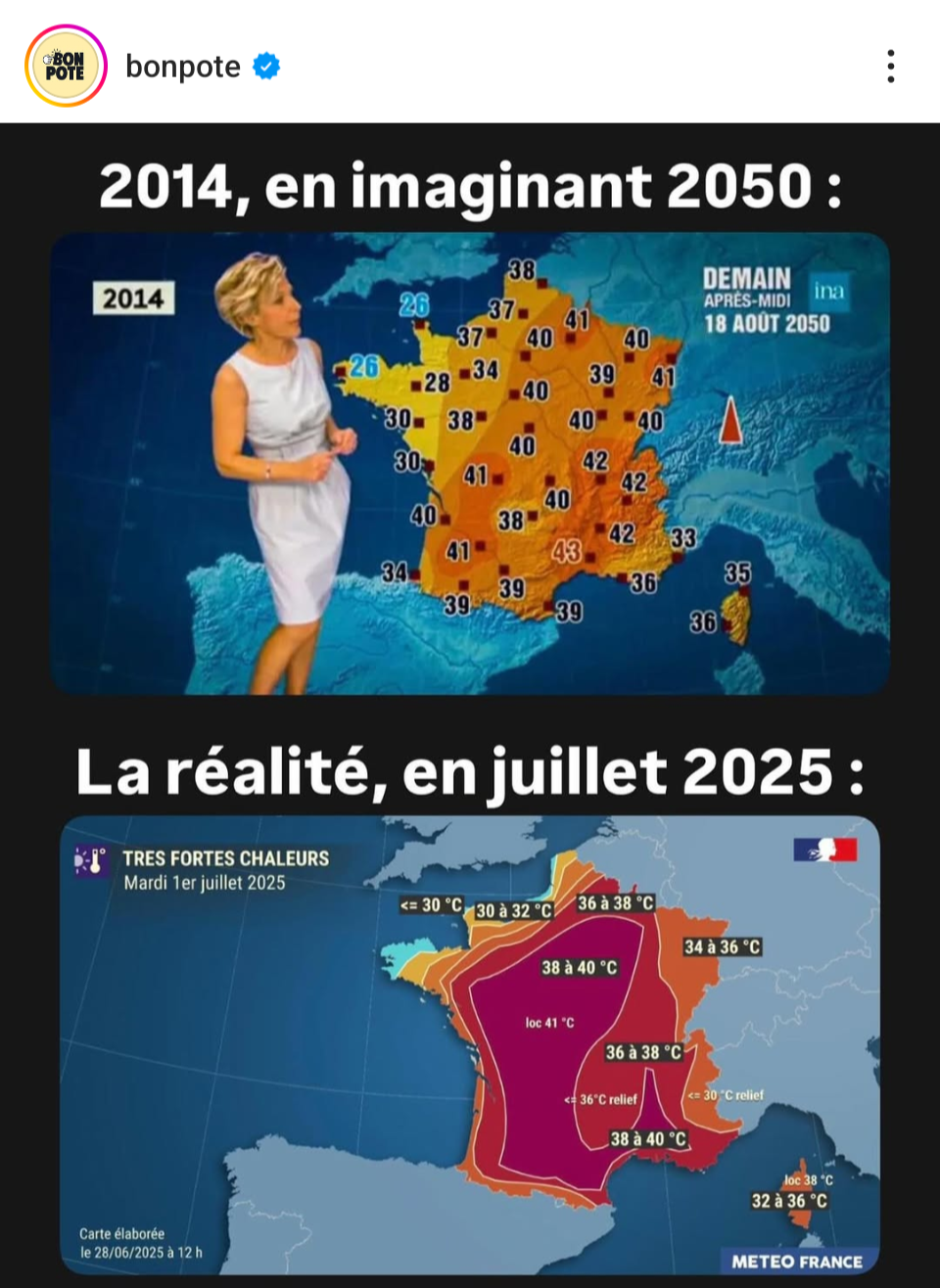 On voit fleurir depuis quelques jours une curieuse résurgence de 2014 dont je me rappelle fort fort bien avec Evelyne Dhéliat qui nous fait une météo de 2050. Et je me souviens qu’en effet, en cette époque lointaine, les températures présentées étaient surréalistes. Mais oui, dix ans plus tard nous y sommes déjà, et même pas en plein mois d’août.