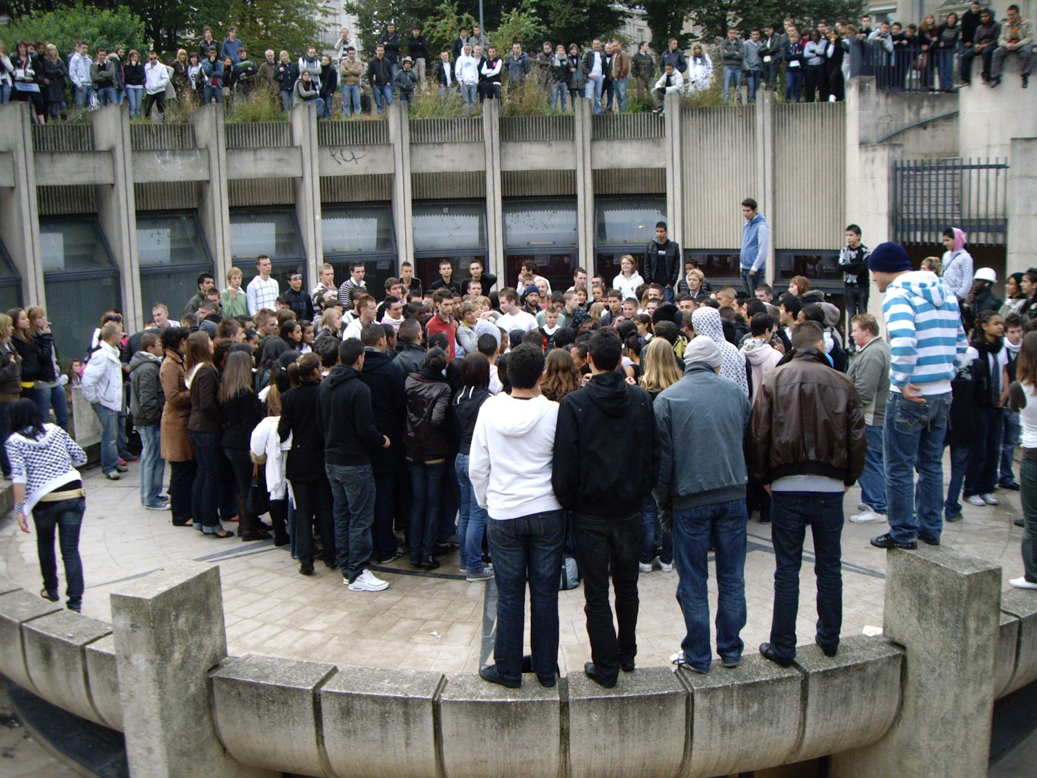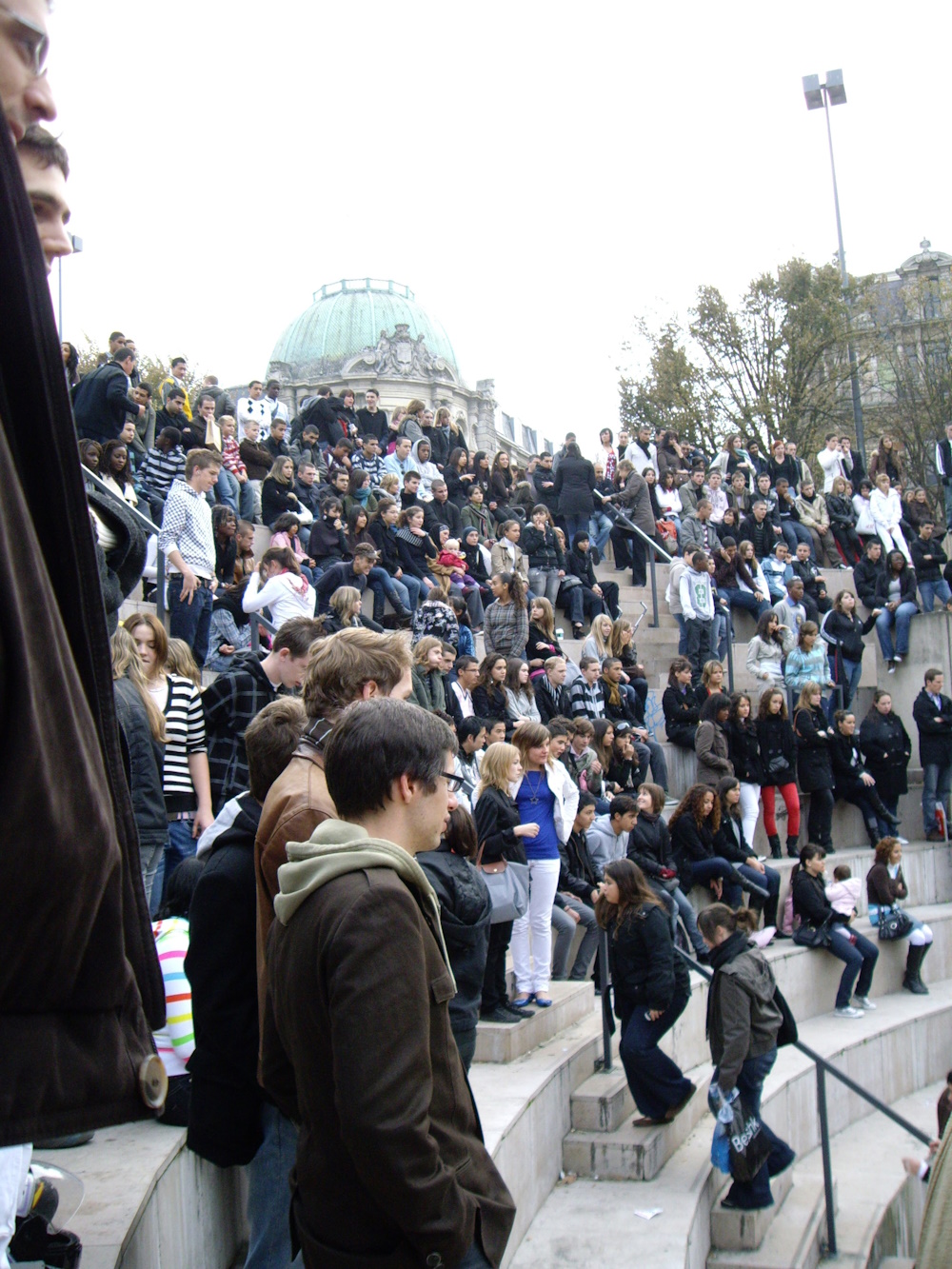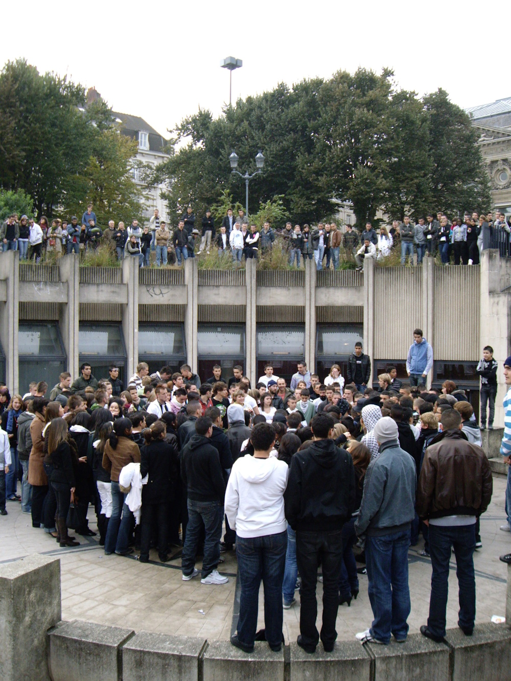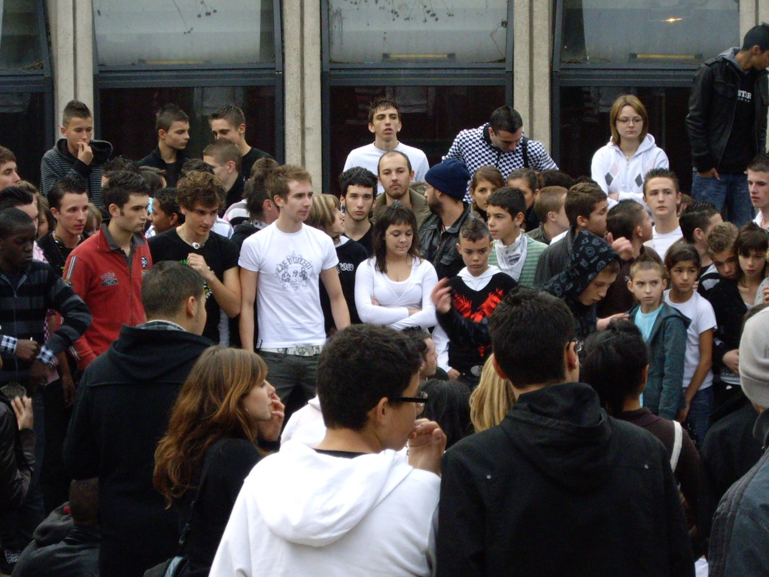 C’était il y a 18 ans, alors qu’on était en week-end à Lille avec des amis. J’en ai déjà parlé ici, mais j’en remets une couche pour l’occasion car c’est un souvenir important. On avait vu ce rassemblement alors qu’on se promenait dans le centre de Lille, notamment en sortant de la station de métro lillois République – Beaux Arts. Et comme vous pouvez le constater, ce n’était pas un petit rassemblement, et ça nous avait intrigué car la moyenne d’âge était vraiment basse. On était vraiment sur des minots de 15-17 ans, et voyez le look de l’époque.