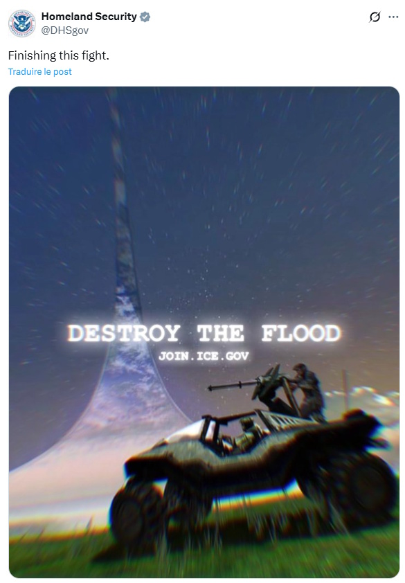 On entend depuis longtemps maintenant les expulsions et les détentions dans des conditions inhumaines des équipes ICE (Immigration and Customs Enforcement : service de l’immigration et des douanes des USA) qui font partie de Homeland Security (Département de la Sécurité intérieure des USA, soit l’équivalent du ministère de l’Intérieur en France, mais avec beaucoup plus de prérogatives). Sur Twitter, ils font la promotion de leurs services pour recruter des agents ICE pour continuer leurs méfaits. Récemment, ils ont utilisé l’imagerie Pokemon et le slogan bien connu « Attrapez les tous » pour promouvoir ce métier. Et là, ça va encore plus loin puisque c’est carrément le jeu vidéo HALO.