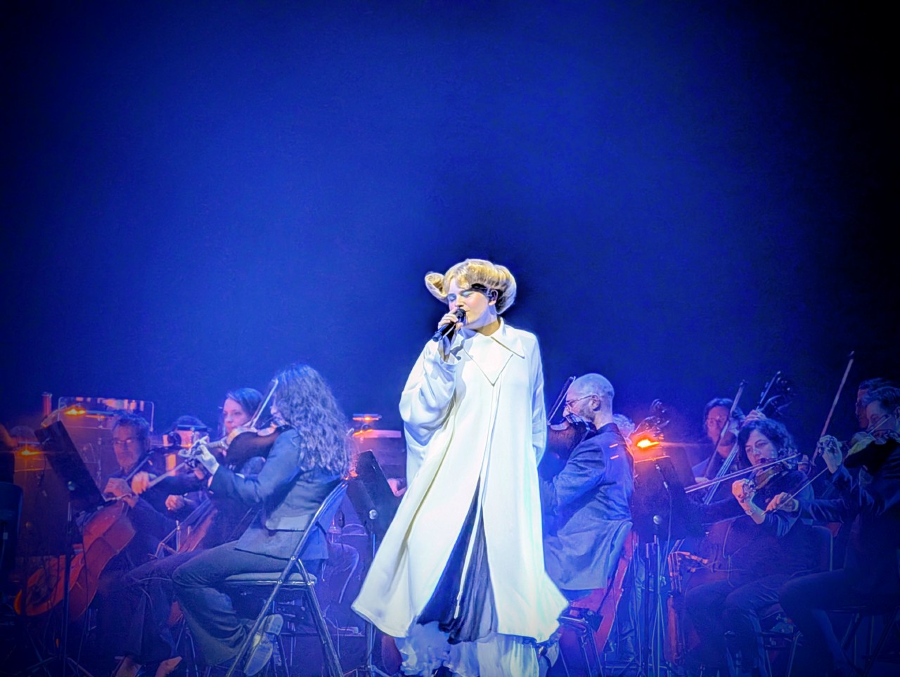 Le concert revêt également une mise en scène très différente des autres spectacles, parce que l’on est un peu plus dans un cadre formel avec l’orchestre, et la chanteuse embrasse totalement ce nouveau concept. On la retrouve donc avec cette coiffure semi-antique full drag queen et une tunique blanche ample, comme une immense surchemise qui flotte autour d’elle (qu’elle abandonne ensuite au profit d’une petite robe noire en dessous). Elle est dans ce rôle d’allégorie vivante de la musique, mais est-ce Calliope, Érato, Melpomène, ou un peu d’Euterpe et de Terpsichore ? On l’ignore, mais on adore !