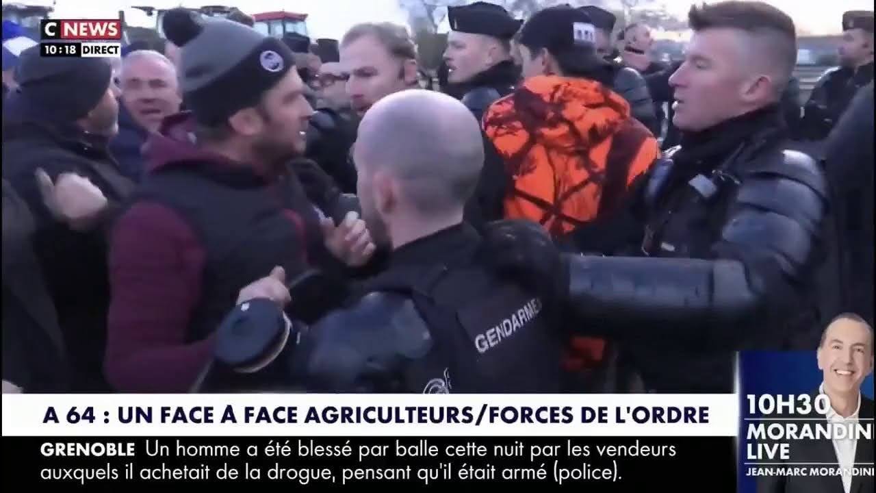 On y voit des extraits d’affrontements entre la police et des agriculteurs en manifestation. Et Pascal Praud nous explique très candidement :