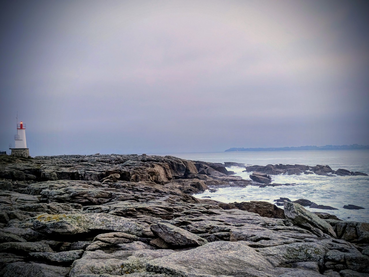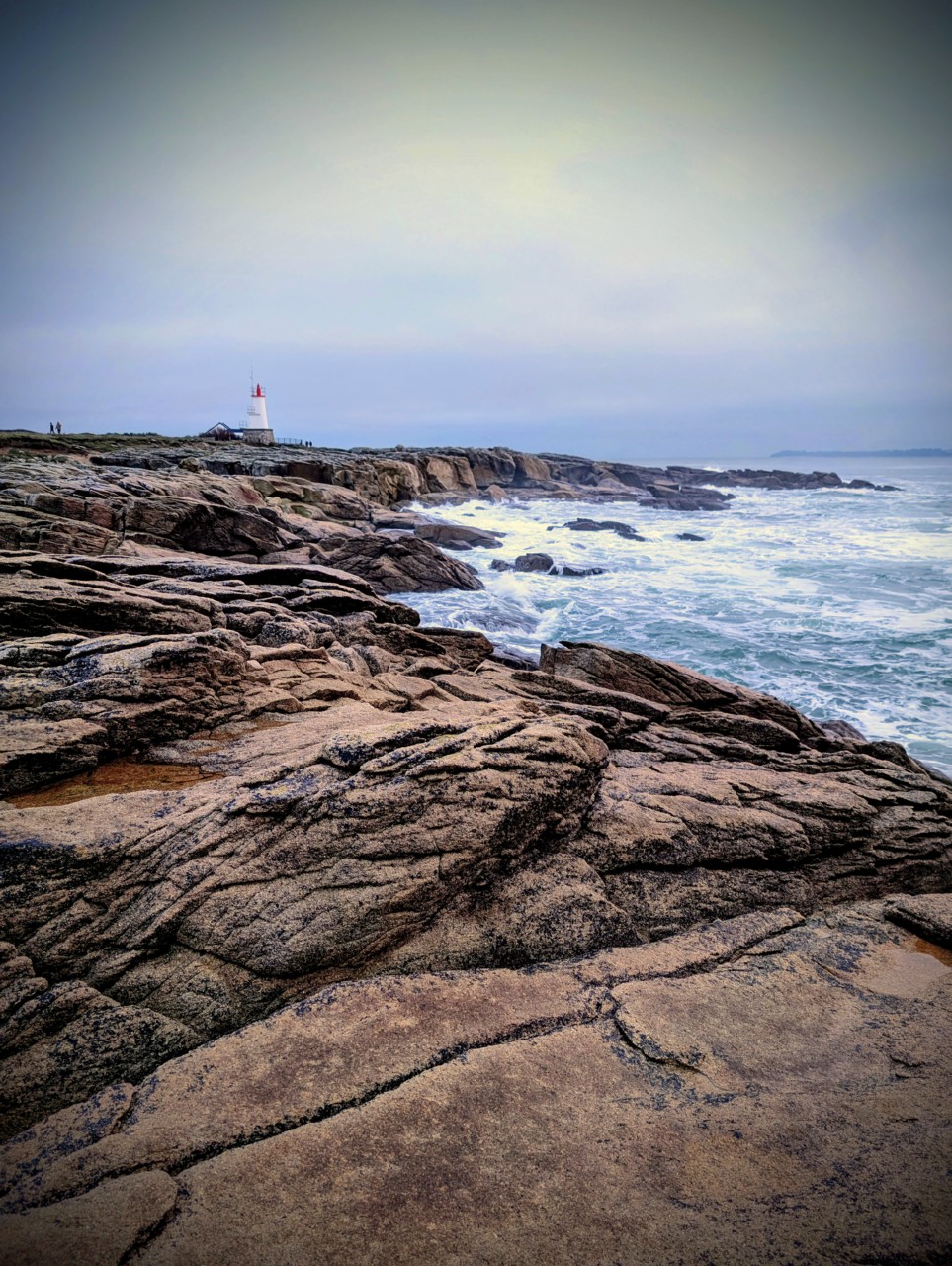 Ce bout de côte est fait d’une roche rougeâtre genre granit rose, et avec le petit phare-balise, cela donne de belles perspectives avec l’île de Groix en fond. Bref j’y reviendrai encore et encore.