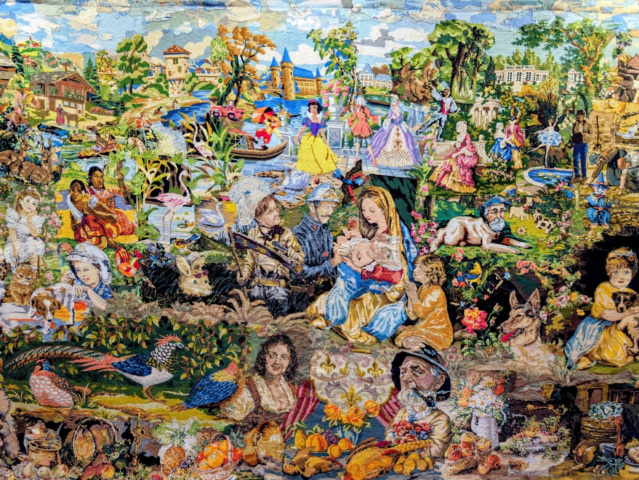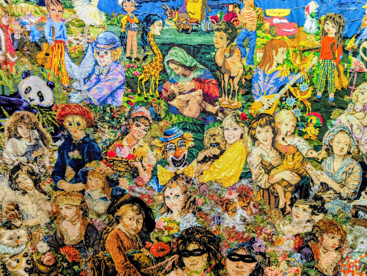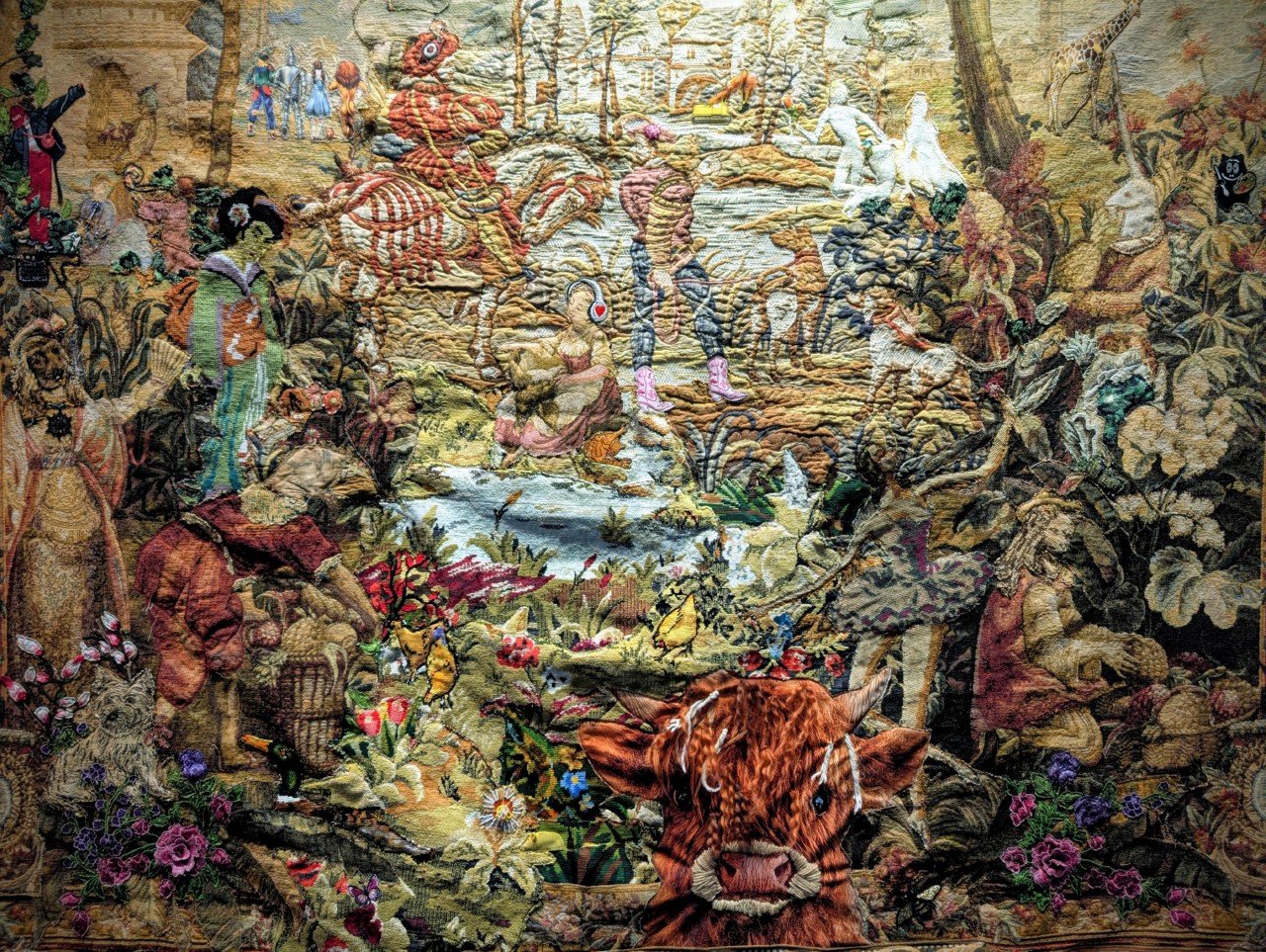 Il y avait une petite foire d’art contemporain à Rennes, au Couvent des Jacobins, où nous sommes donc allés faire un tour. C’était plutôt une chouette sélection de galeries et d’œuvres, et j’ai adoré ces tapisseries contemporaines qui flirtent habilement entre les techniques du Moyen-Âge des maîtres belges et flamands, mais aussi le canevas kitsch de mamie et des représentations encore plus décalées. Cela donne d’impressionnants patchworks qui sont à la fois intéressants dans la curieuse juxtaposition qu’ils présentent, mais aussi dans la masse incroyable de travail pour un truc plutôt drôle et assez fascinant à certains égards.