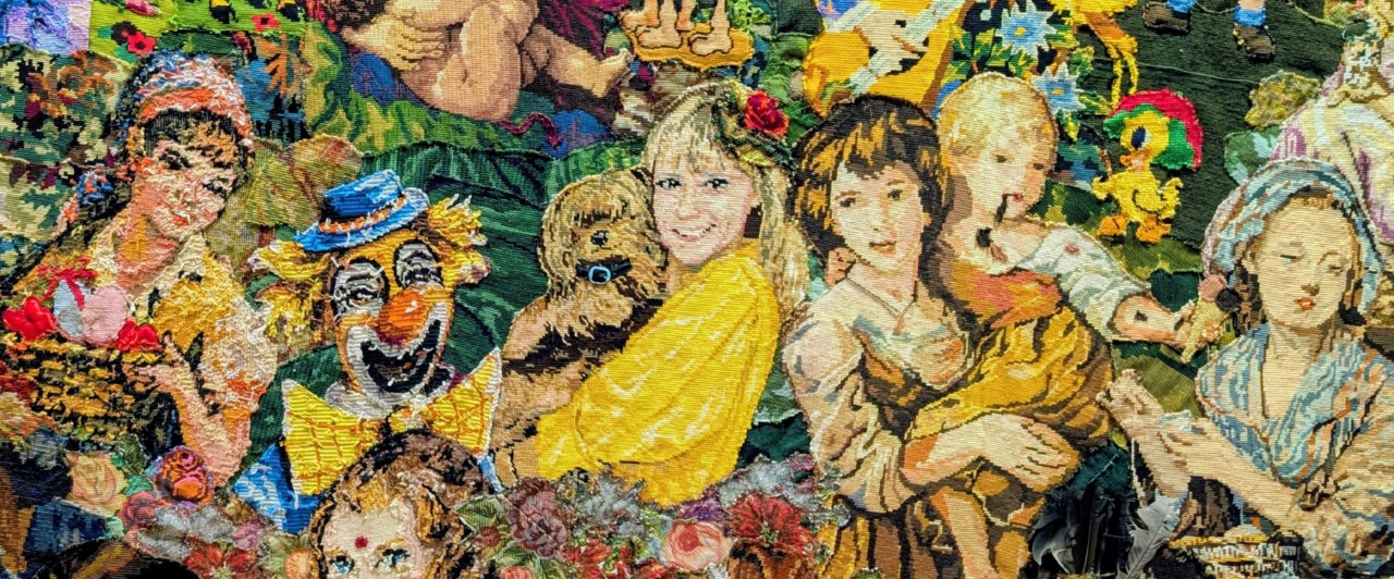 Il y avait une petite foire d’art contemporain à Rennes, au Couvent des Jacobins, où nous sommes donc allés faire un tour. C’était plutôt une chouette sélection de galeries et d’œuvres, et j’ai adoré ces tapisseries contemporaines qui flirtent habilement entre les techniques du Moyen-Âge des maîtres belges et flamands, mais aussi le canevas kitsch de mamie et des représentations encore plus décalées. Cela donne d’impressionnants patchworks qui sont à la fois intéressants dans la curieuse juxtaposition qu’ils présentent, mais aussi dans la masse incroyable de travail pour un truc plutôt drôle et assez fascinant à certains égards.