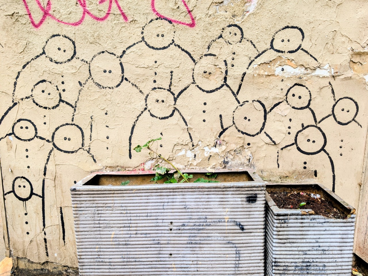 J’adore ce genre de Street Art très simple et qui serait à la portée de beaucoup. Un feutre noir, des formes simples. Mais voilà il faut avoir cette idée brillante !! L’effet est génial avec les regards qui convergent, et le croisement entre le dessin et son environnement réel.