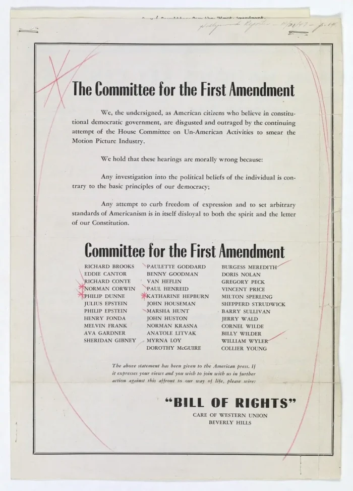 The Committee for the First Amendment is a large collective of artists, storytellers, and cultural leaders standing together to defend free expression against government repression, industry complicity, and intimidation.