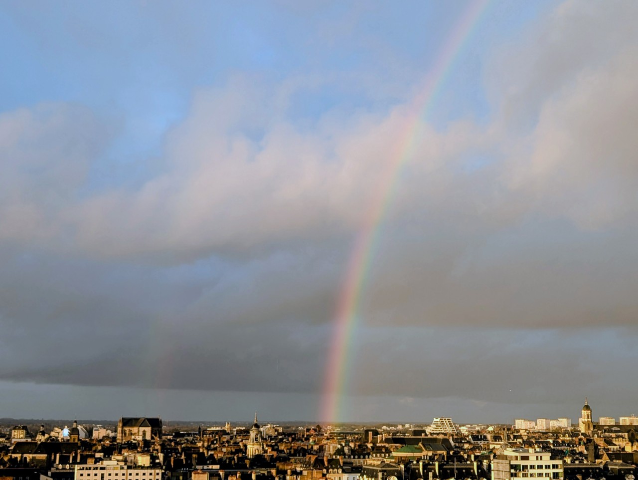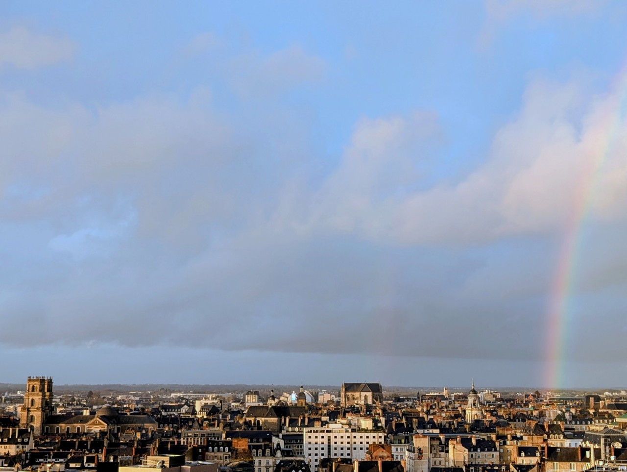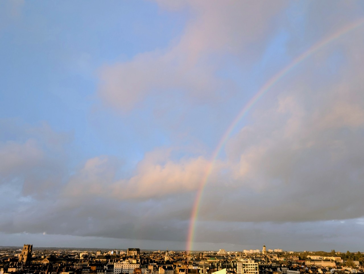 Après une énième journée de flotte et de grisailles, ça s’est tout de même brièvement levé au coucher du soleil, et pendant quelques minutes on a eu un magnifique arc-en-ciel au-dessus de la vieille ville de Rennes.