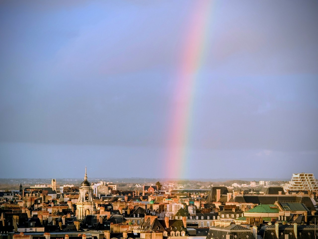Après une énième journée de flotte et de grisailles, ça s’est tout de même brièvement levé au coucher du soleil, et pendant quelques minutes on a eu un magnifique arc-en-ciel au-dessus de la vieille ville de Rennes.