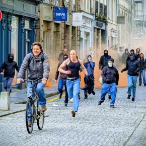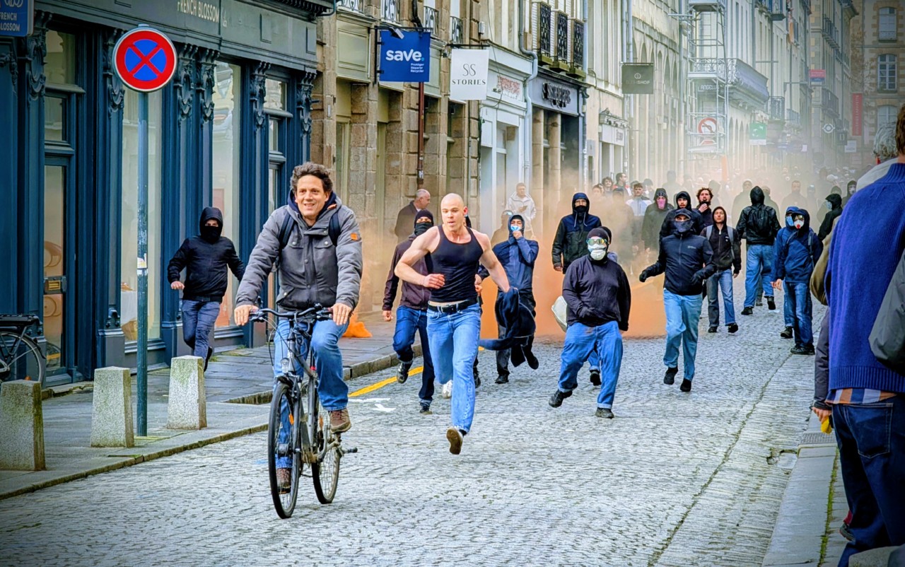 La photo est assez folle même si prise complètement au hasard et plutôt par réflexe de ma part. Le type en vélo juste devant n’a aucune conscience de ce qui se passe derrière lui. Et le facho avec son look de skin des années 80 fait juste froid dans le dos, tout en paraissant flotter dans les airs en prenant ses jambes à son cou. On n’est pas resté évidemment, donc je ne sais pas ce qui s’est passé ensuite.