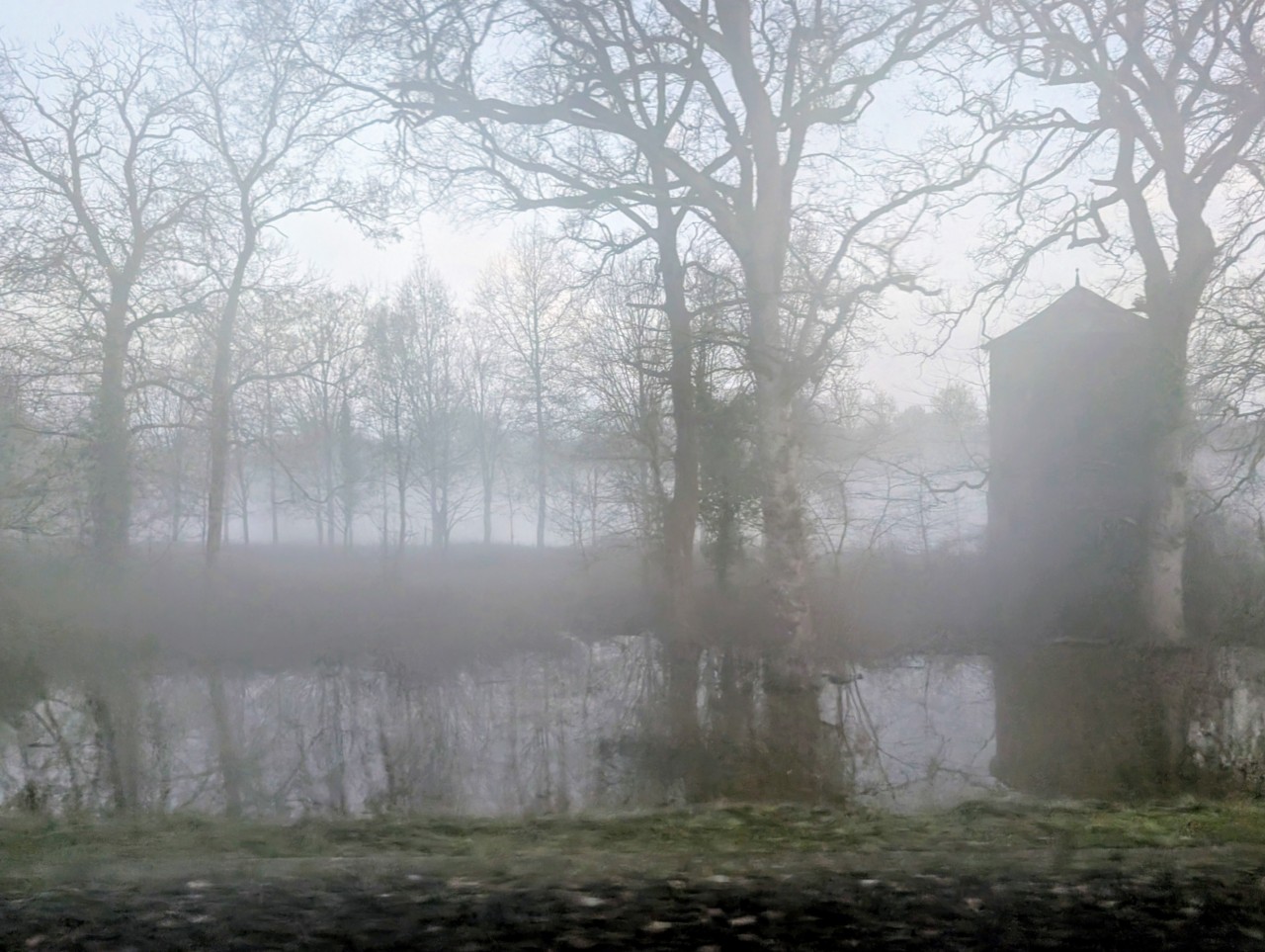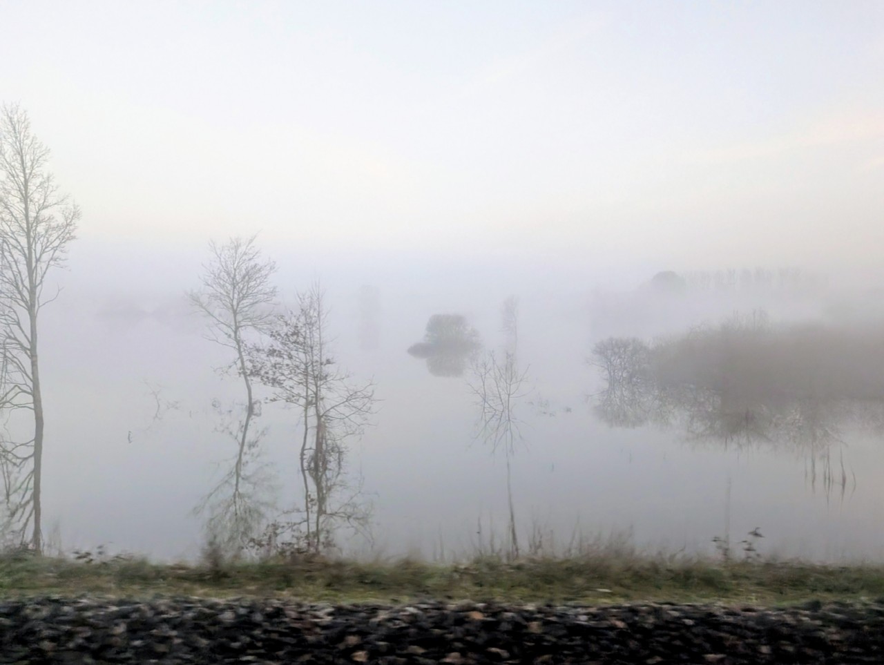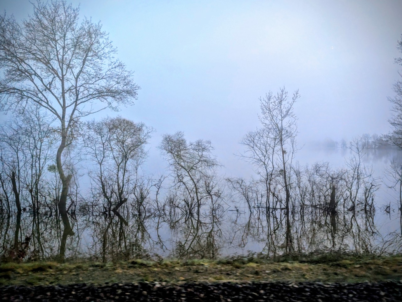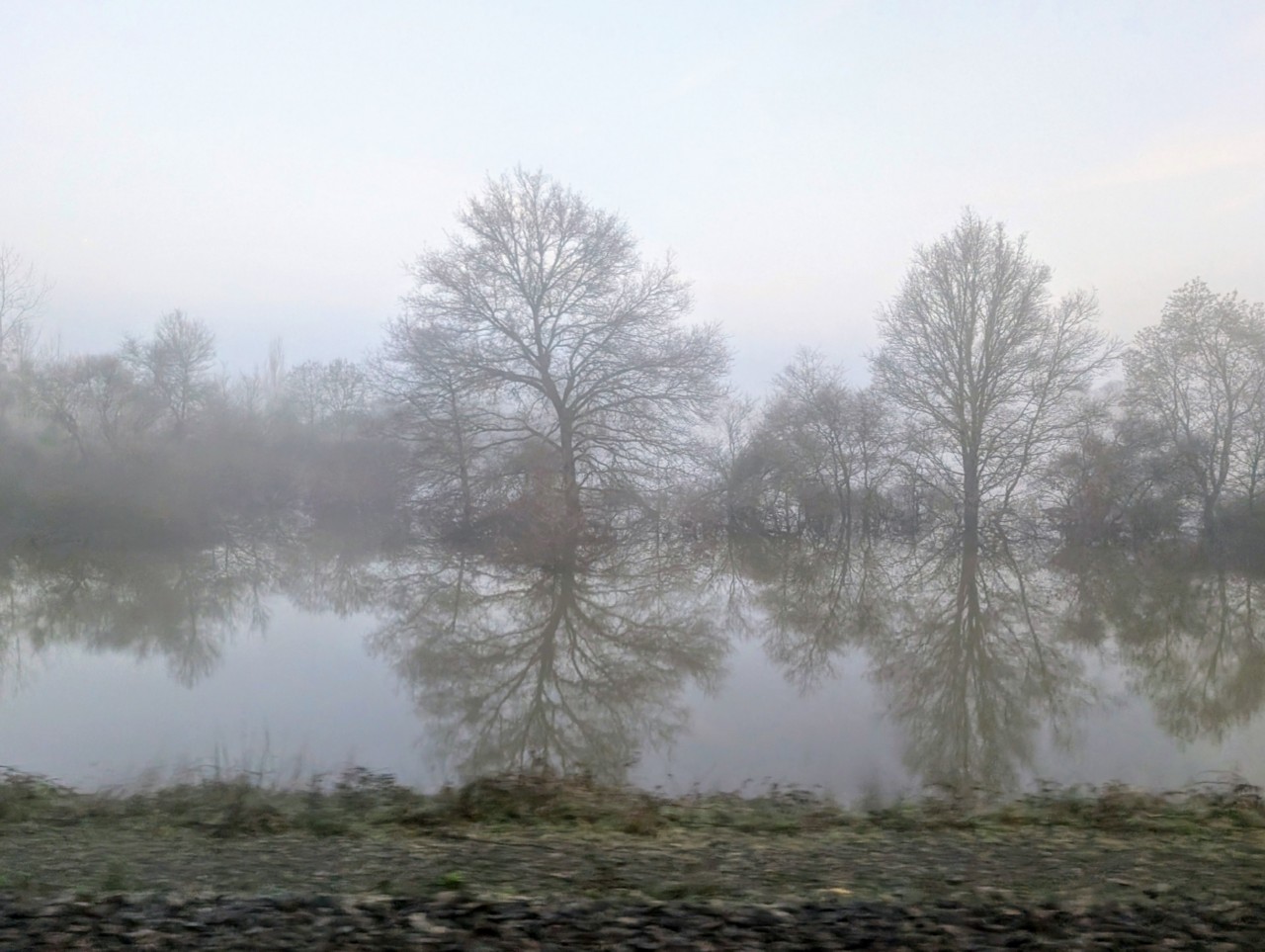 En ce moment, entre les plaines inondées et les matins brumeux, le train file comme le tramway de Chihiro. On a l’impression d’être encore en plein rêve, en suspension dans un monde à jamais hivernal, fait de nuées blanchâtres, d’arbres dépenaillés sur des miroirs et d’étendues aquatiques infiniment réfléchissantes.