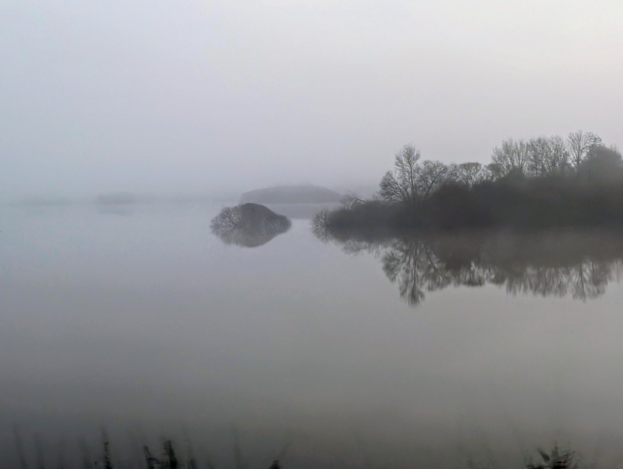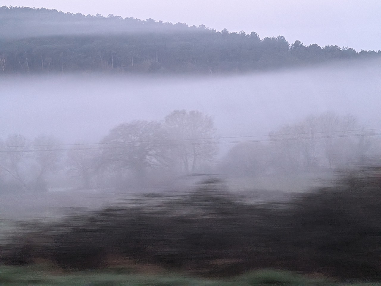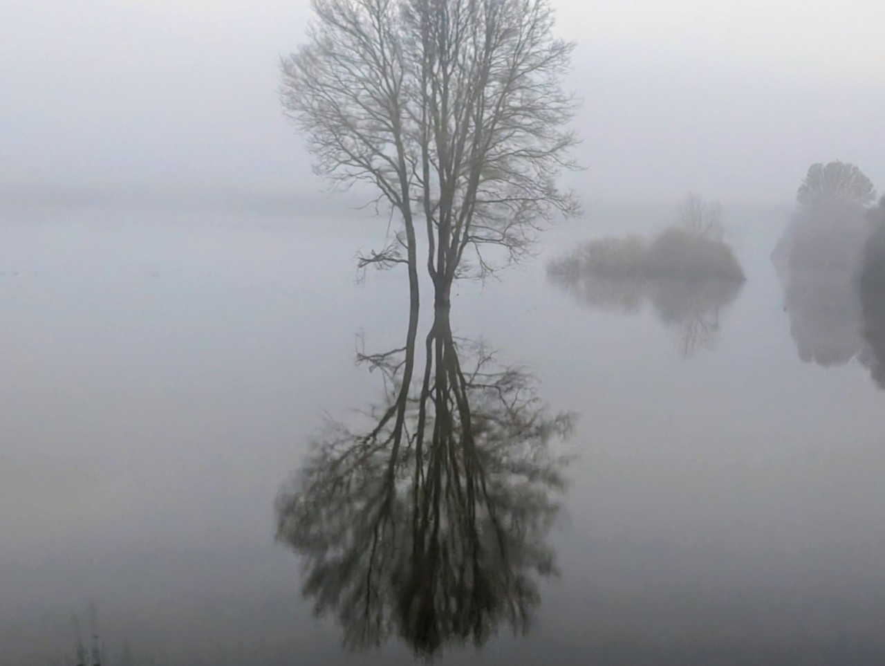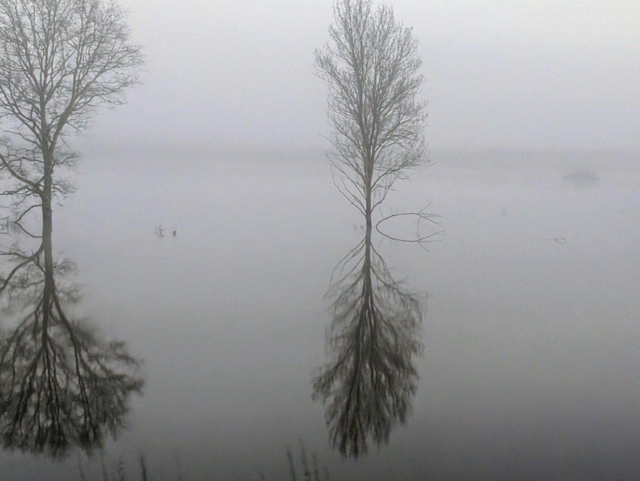 En ce moment, entre les plaines inondées et les matins brumeux, le train file comme le tramway de Chihiro. On a l’impression d’être encore en plein rêve, en suspension dans un monde à jamais hivernal, fait de nuées blanchâtres, d’arbres dépenaillés sur des miroirs et d’étendues aquatiques infiniment réfléchissantes.