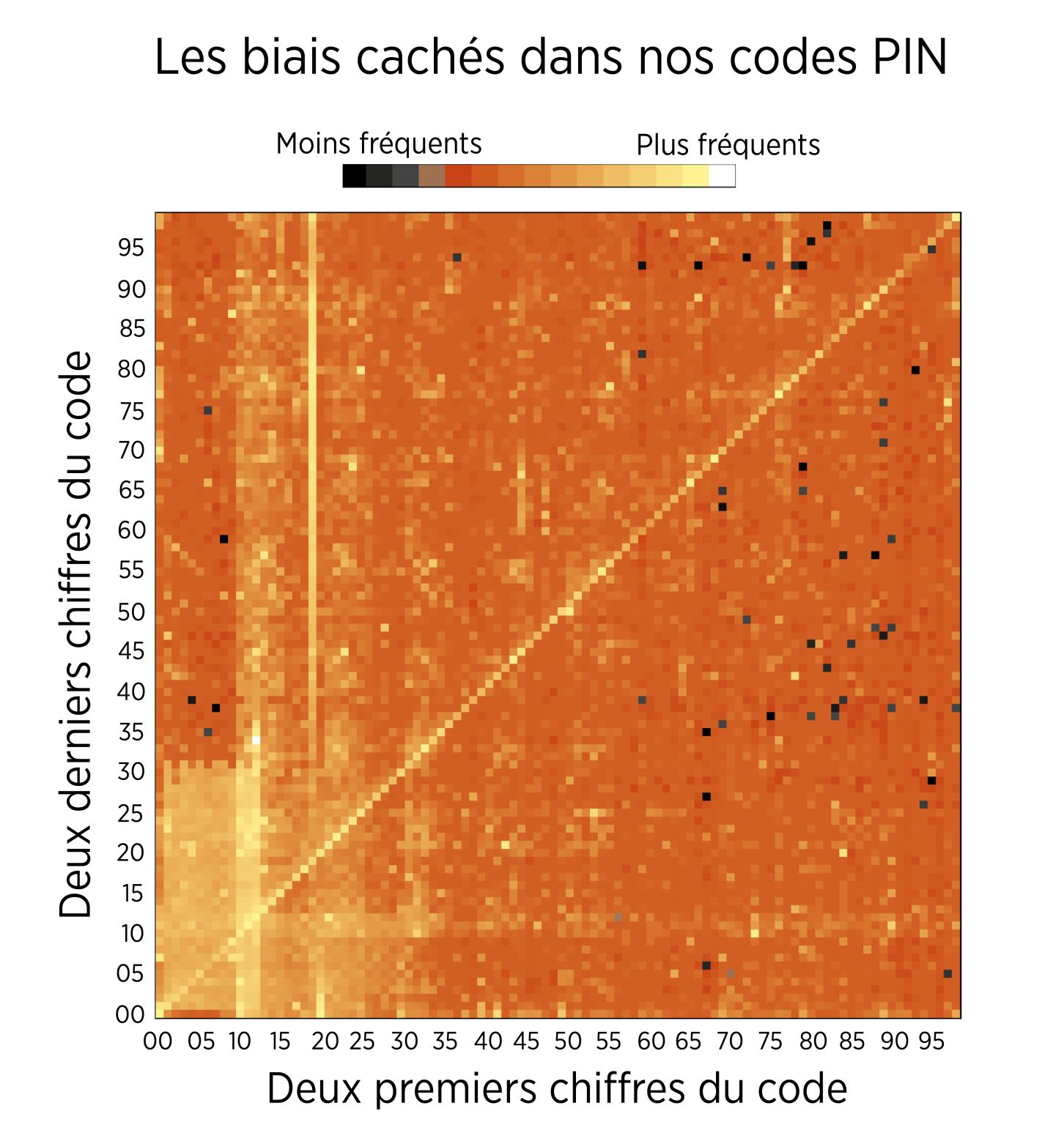 La ligne verticale brillante vers la gauche, c’est tous les codes qui commencent par 19 — les années de naissance (1987, 1993…). Chaque génération a laissé sa trace. On devine même un début de ligne pour 2000-2005.