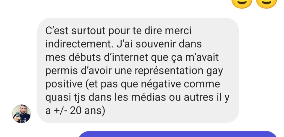 Et j’ai remis en tête d’article un des derniers messages reçus concernant le blog. Cela me fait sourire de continuer de temps en temps à croiser des gens sur les réseaux sociaux, et qui se souviennent de l’ancien temps. C’est souvent d’une teneur équivalente : oooh quand j’étais jeune et que je cherchais des « infos gay » sur les Internets, il n’y avait pas grand chose mais il y avait toi, et ça m’avait fait du bien de lire tes histoires.