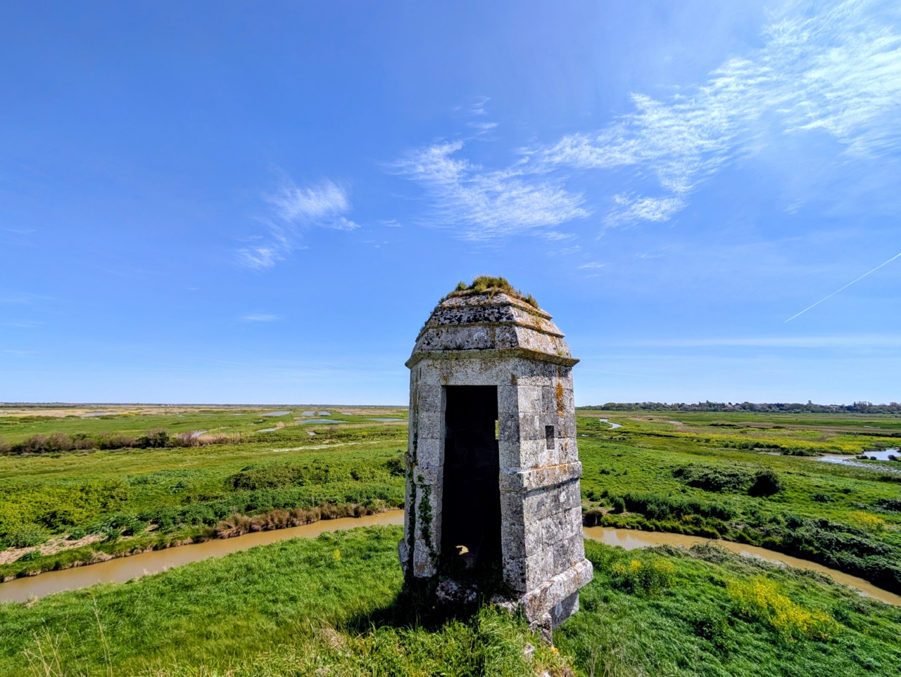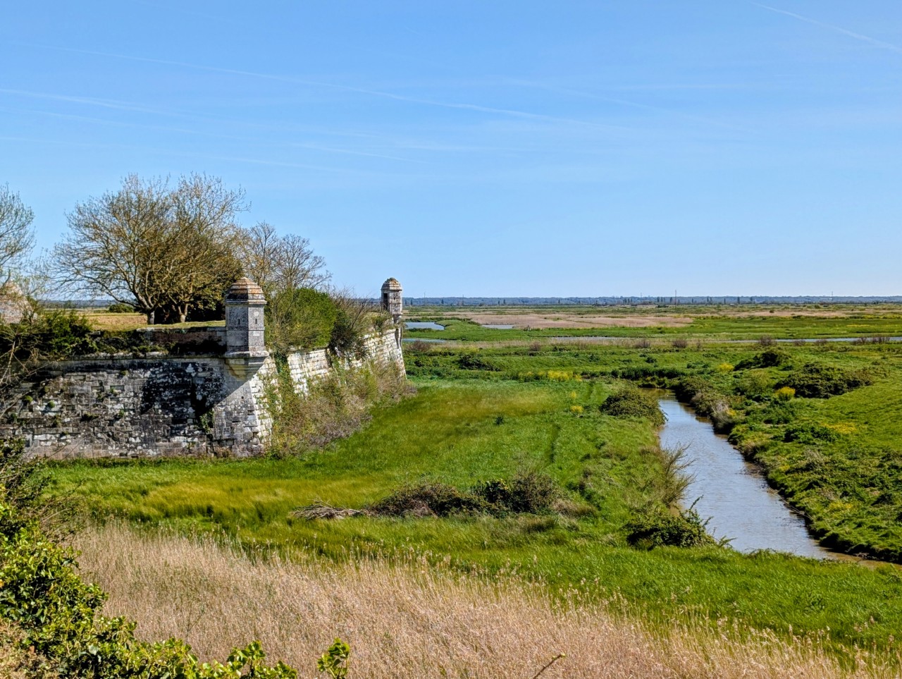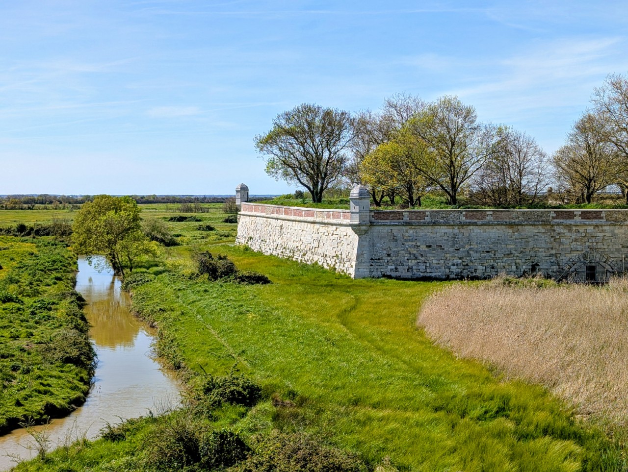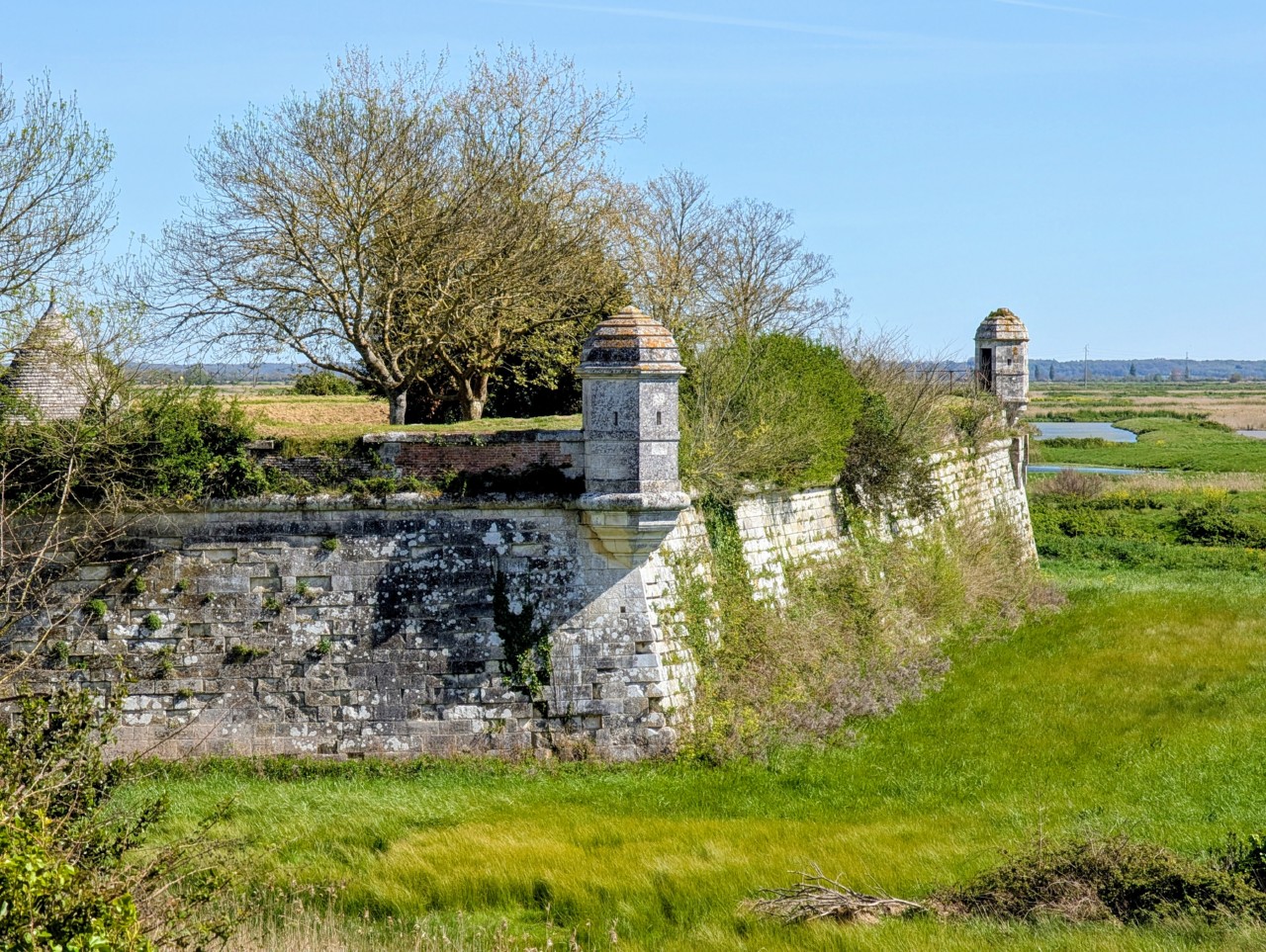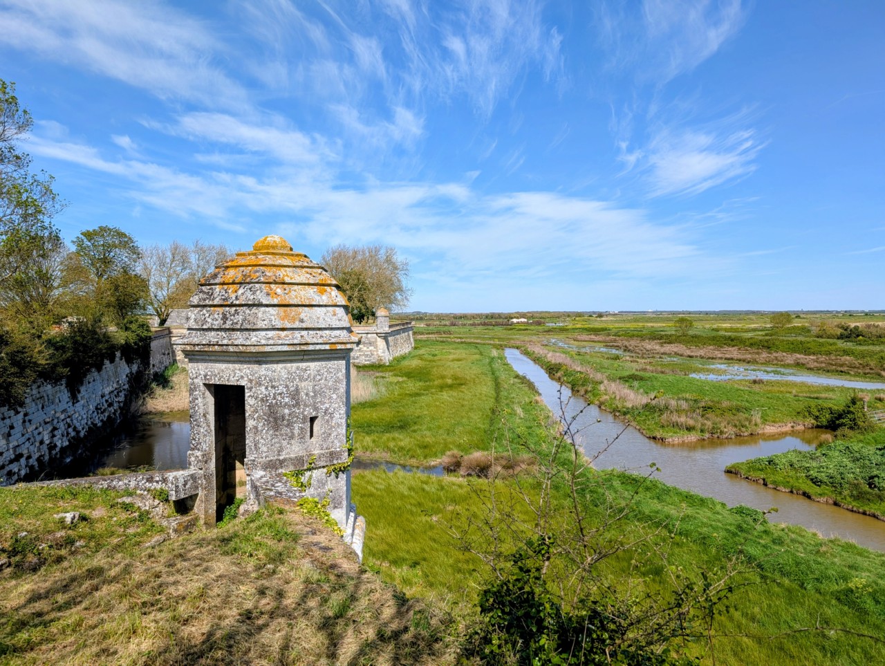 Donc il s’agissait d’abord d’un important port saulnier (autour du commerce du sel) fin 16ème, et qui est devenu stratégique avec la présence des anglais mais aussi des lignes maritimes hollandaises et espagnoles au 17ème. Ajoutons à cela, bien sûr, les guerres de religion avec la protestante La Rochelle à proximité, et donc c’est devenu une place forte majeure et dont les fortifications sont merveilleusement bien conservées. On retrouve un village complètement entouré avec les dessins en étoile pointue qu’on connaît bien, et aujourd’hui dans un environnement marécageux maîtrisés par une kyrielle de canaux. Donc l’endroit est encore peu construit et impressionne vraiment comme une citadelle au cœur d’une végétation assez sauvage. C’est très vert et on y croise toute sorte de bestioles des marais : grenouilles, oiseaux de proie, échassiers, canards et cygnes, mais aussi ragondins et des tas de cigognes qui ont élu domicile dans le coin à l’année.