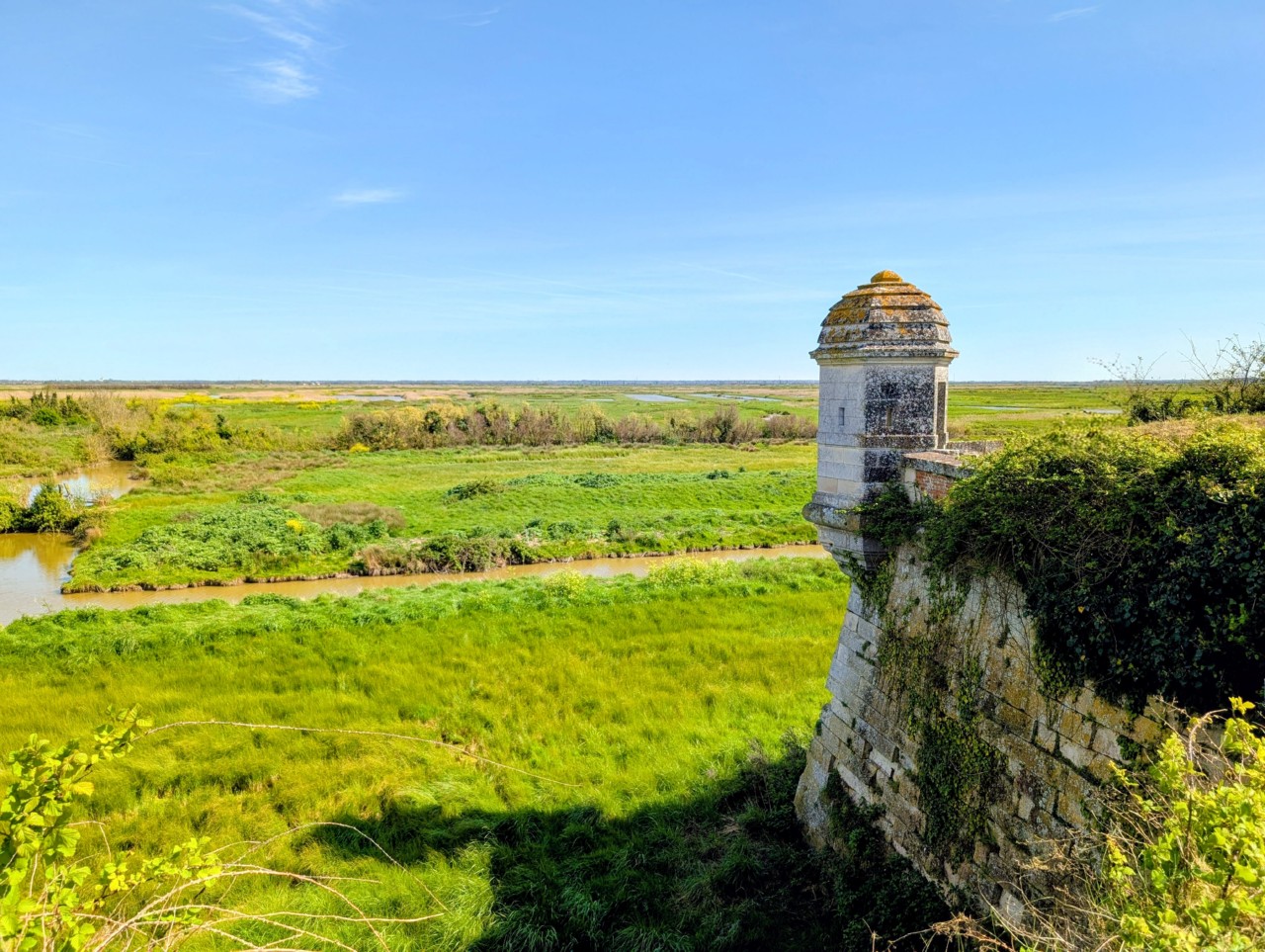 Donc il s’agissait d’abord d’un important port saulnier (autour du commerce du sel) fin 16ème, et qui est devenu stratégique avec la présence des anglais mais aussi des lignes maritimes hollandaises et espagnoles au 17ème. Ajoutons à cela, bien sûr, les guerres de religion avec la protestante La Rochelle à proximité, et donc c’est devenu une place forte majeure et dont les fortifications sont merveilleusement bien conservées. On retrouve un village complètement entouré avec les dessins en étoile pointue qu’on connaît bien, et aujourd’hui dans un environnement marécageux maîtrisés par une kyrielle de canaux. Donc l’endroit est encore peu construit et impressionne vraiment comme une citadelle au cœur d’une végétation assez sauvage. C’est très vert et on y croise toute sorte de bestioles des marais : grenouilles, oiseaux de proie, échassiers, canards et cygnes, mais aussi ragondins et des tas de cigognes qui ont élu domicile dans le coin à l’année.