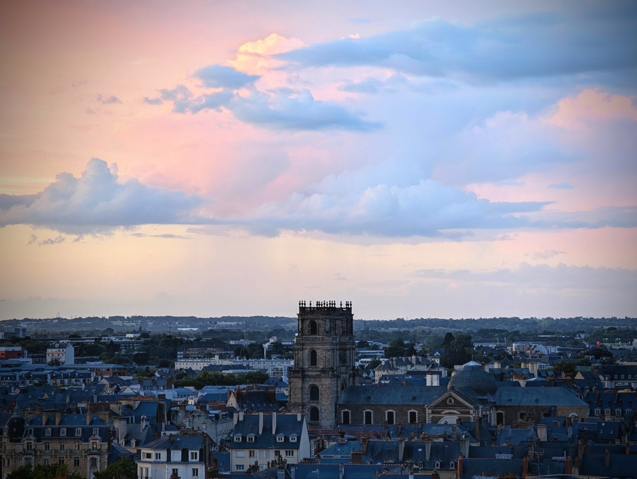 Bon bah il faut s’y attendre en Bretagne je suppose. Mais bon ça donne un sacré joli ciel sur la cathédrale de Rennes. Et côté coucher de soleil, bah ça flotte juste devant, mais c’est très localisé. Je plussoie7