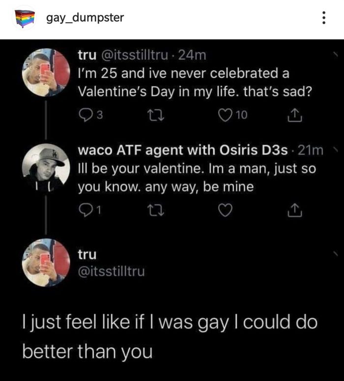 Le mec hétéro qui se plaint qu’il est seul pour la St Valentin, le pédé qui se propose, et l’hétéro qui répond que malgré tout il peut tout de même...