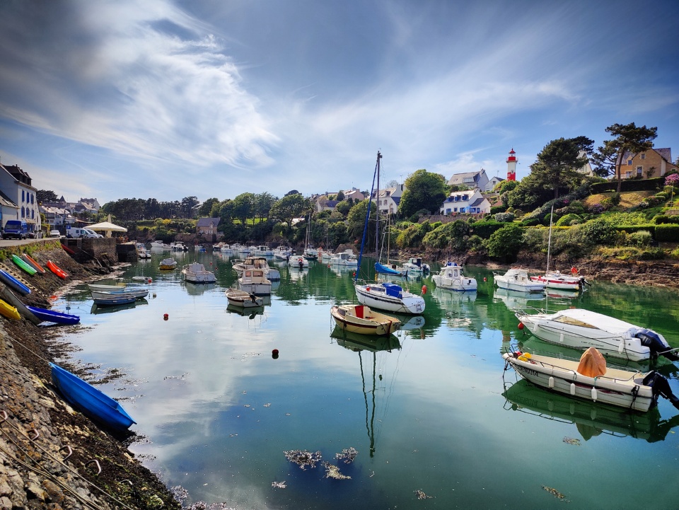 Ce port, qui est l’image de carte postale classique de Bretagne, est une des communes de Clohars-Carnoët, et un de mes spots favoris. En cette fin de journée, le ciel était d’une belle pureté, la lumière printanière se faisait presque estivale, et la marée basse ainsi qu’un vent réduit à souffle tiède donnaient à l’atmosphère une douceur absolue. Je plussoie