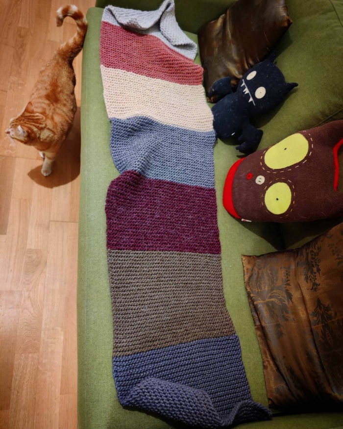 En moins de 15 jours de petit tricotage en soirée, voilà ma première écharpe en mode énorme machin chaud en laine. Vivement qu’il fasse froid !!! (Je n’avais pas repris les...